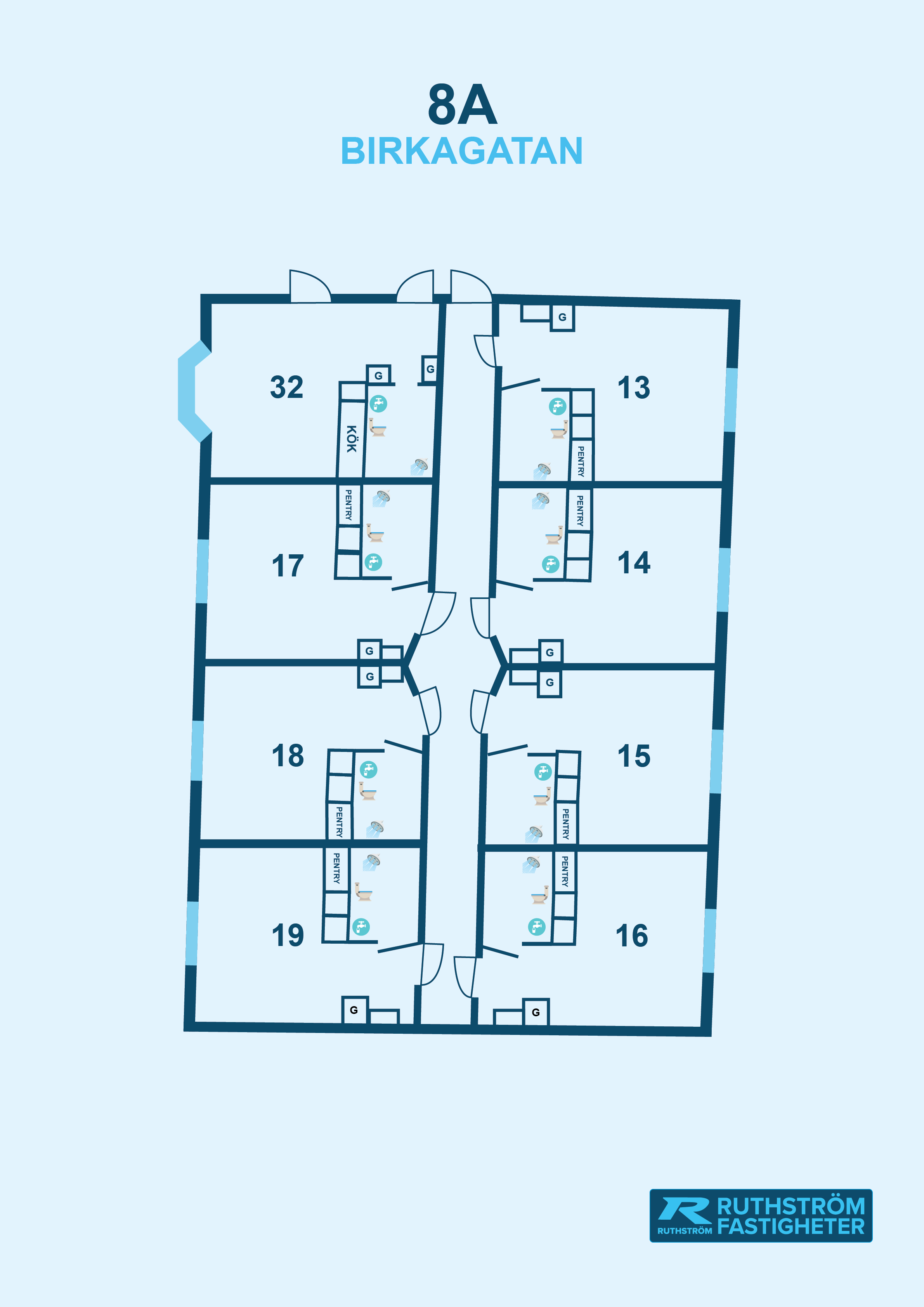På Birkagatan 8A finns kompakta lägenheter på 21 kvadratmeter, avsedda för en person. Perfekta för dig som söker ett bekymmersfritt boende under studietiden med tiomånaderskontrakt (25 augusti–10 juni).